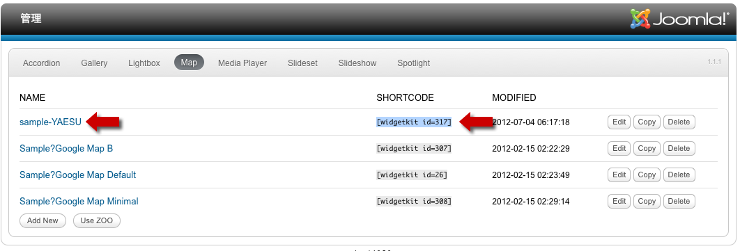 新たに作った項目のShortcode[widgetkit id=317]をメモして置きましょう。