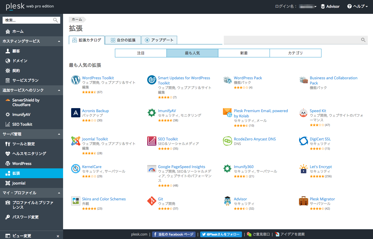 WordPressやJoomla、Drupal等のCMSも簡単インストール出来、GitHub/BitBucketなどのリモートレポジトリとも連携可能の様です。欲を出せばDocker HUB上の多彩なアプリケーションをPleskから起動・管理出来るらしい、WebDAVだって簡単にインストール出来ます(契約のメモリー容量による)数多くの機能拡張(有料・無料あり)で自分仕様のサーバを構築変更が少ない知識で自由自在に出来るのは大変助かっています。